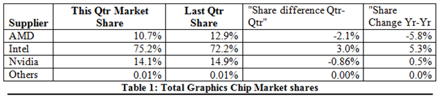 Intel's desktop processor embedded graphics (EPGs) shipments decreased from last quarter by -7.4%, and notebooks decreased by -7.3%. The company's overall PC graphics shipments decreased -7.4% from last quarter.