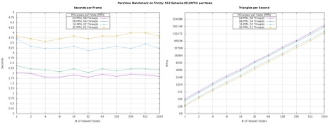 Figure 5: OpenSWR scaling results to 1024 Intel Xeon (Haswell) nodes on the Trinity supercomputer. (Results courtesy Kitware)