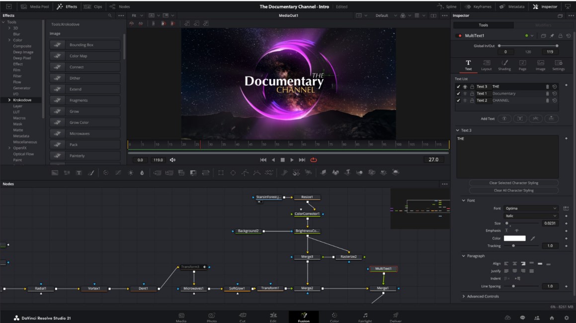 Fusion now proudly features Krokodove, the popular and ever-growing library of compositing tools. The collection ranges from utility tools that improve productivity, to essential vector and data tools, to customizable 2D and 3D graphic templates that can be used throughout DaVinci Resolve.