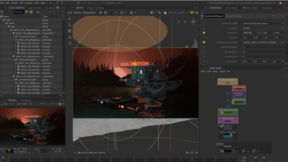 Katana's UI showing the Node Graph and Scene tree for procedural workflows.