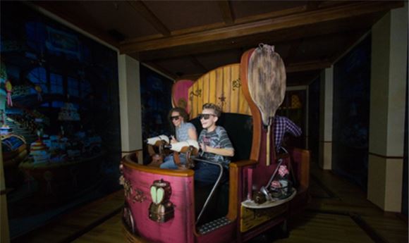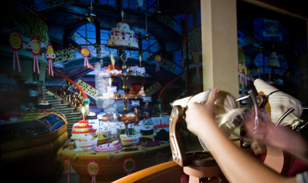 Visitors to ‘Maus au Chocolat’ wear 3D glasses and, as they are transported around a custom-designed interior space on motorized vehicles, they are immersed in an animated video re-creation of a traditional bakery owned by the fictional master confectioner, Oskar Koslowski. It quickly becomes clear that Herr Koslowski has a problem: his bakery has been over-run by mice! Visitors are then given a simple task: to ‘zap’ as many mice as possible using icing-sugar dispensers that are positioned at the front of each vehicle. The more mice you zap, the higher your score – and the safer Herr Koslowski can sleep, safe in the knowledge that his finest chocolate creations can be enjoyed by children rather than his shop’s unwelcome pests.