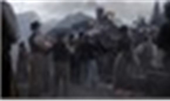 In another scene, locals crowd around a train during the inauguration. The scene was shot at 24 fps and incorporates a real train, which is actually on display in a museum. The team hung a greenscreen around it and added lighting to suggest an outdoor setting. Live action was shot of the characters and the train, which was later integrated with a 2.5D matte painting. Rodeo FX also added CG smoke and atmospheric effects.