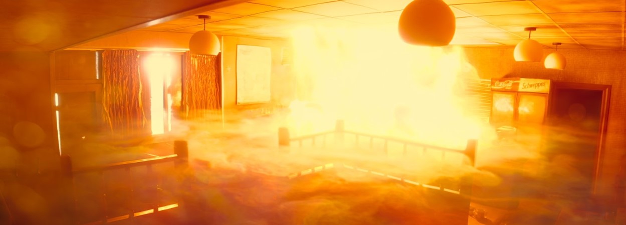 Later on in the film Spike sneaks off the island, seeking medical assistance for his mother Isla (portrayed by Jodie Comer). As they search for Dr. Ian Kelson (played by Ralph Fiennes), they are forced to seek safety in an abandoned Happy Eater restaurant. They break in to find a toxic miasma of gas looming overhead, which explodes dramatically when ignited by gunfire.