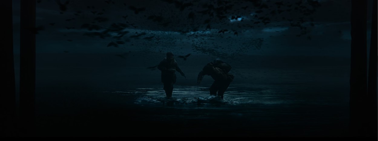 This terrifying sequence contains 130 shots, most of which were fully CG. The causeway itself had to look like it was 1.5 miles long and included a stunning, fully CG aurora nebula sky housing a murmuration of over 10,000 CG birds.