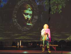 The Magic Flute, which was performed in German, as is customary. "In the typical format, the performers stand in front of painted backdrops and sing in German, and the audience either knows the story or they don't," he explains. "By using CG and projected video, we helped tell the story visually so everyone understood it." In one scene, for example, Prince Tamino sings while gazing at a tiny picture of Princess Pamina. To make this point apparent to the audience, the technologists projected a live video feed of Pamina's face onto a large screen, made to look like a huge picture frame, above the prince.