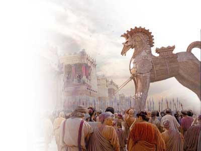 Thus ensues ancient civilization's greatest war, which raged for 10 years around the walls of the beautiful city of Troy, according to mythology, nearly destroying the two most powerful nations of the time—Greece and Troy. The war finally ends when the Greeks overtake Troy after hiding inside the hollowed interior of a huge wooden horse, presented as a gift to the unsuspecting enemy.