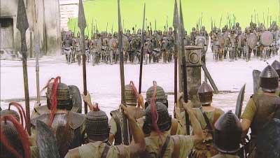 In addition to the 3D actors, the group also cloned many of the extras by rotoscoping them from footage shot against greenscreen. Nicholson also created numerous groups, or "pods," of soldiers using a traditional multipass camera duplication method while filming the live-action battle scenes. Later, these groups and clones were composited into the final scene using Adobe's After Effects, many of them in the middle ground and foreground, resulting in a seamless blend of real actors and synthetic soldiers. In all, Nicholson estimates that approximately two-thirds of the digital soldiers were clones and pods; the other third were 3D models.