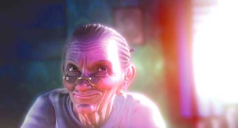 Lundgren's nursing home resident is the most realistic-looking of the three CG characters examined here. The artist created her entirely in Softimage, having first filmed his cousin acting out the different episodes and then retiming the performance in Adobe After Effects to give it more of an animated feel, using the film for a reference. He wanted the character's expressions and reactions to be humorous and a bit slapstick in nature, but not completely over the top.