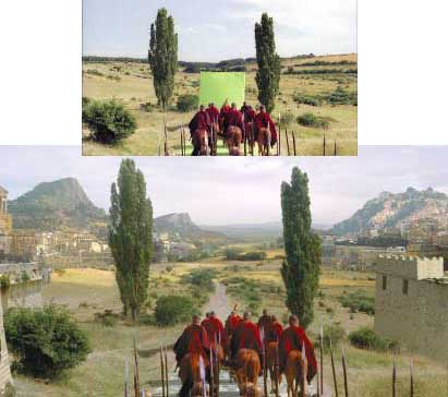 In addition to these physical locations, there are 2D matte paintings—including those used for the city of Capua—which were designed and constructed in Adobe's Photoshop. For added realism, many of the mattes contain embedded live-action elements composited with Adobe's After Effects. Still other sets were built in the computer, including Rome, which was a combination of CG and digital mattes with 3D camera moves applied to the 2D elements using Alias Systems' Maya Live and 2d3's boujou matchmoving software.