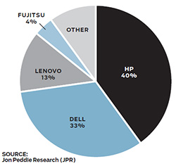 The market shares of the "big four" Tier 1 OEMs changed little in the first quarter of 2014. With 39.7% of units sold (basically flat from Q4), HP continues to dominate the workstation market, with number-two Dell at 33.3%. Lenovo and Fujitsu shipped the exact same percentage of units in the first quarter as they did in Q4 2013: 12.9% and 3.9%, respectively. JPR estimates the remaining 10.3% of units came from a host of smaller workstation suppliers, including Tier 2 OEMs and system integrators (SIs).